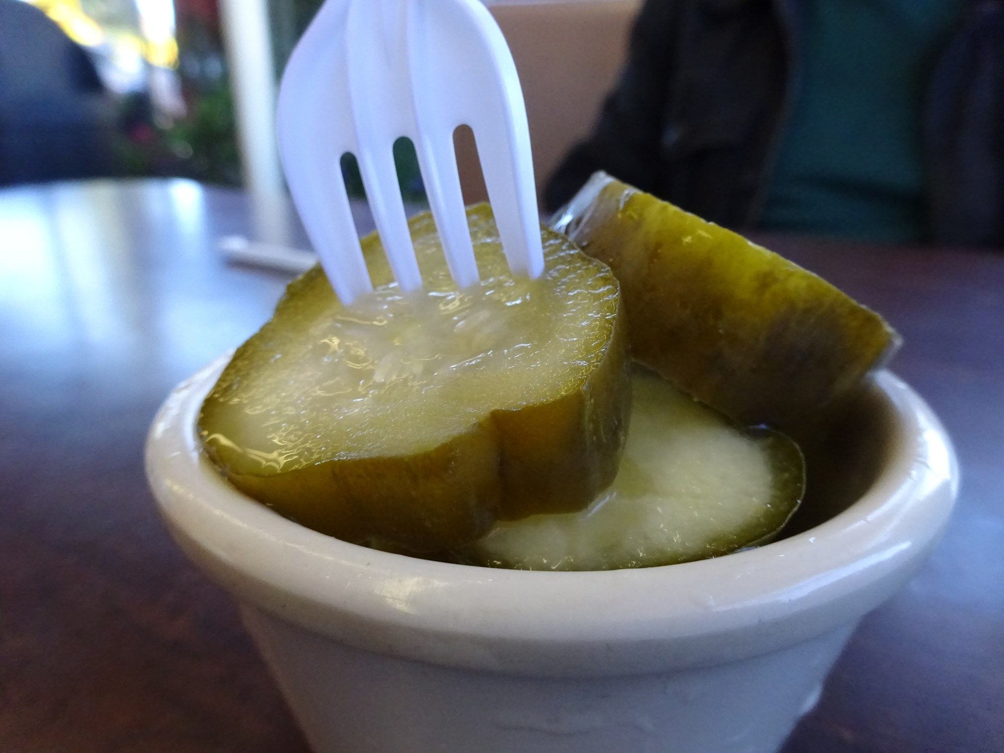 In deli fashion, they plop down a container of pickles as soon as you sit down. From what I remember, the pickles here are pretty good, though I didn’t get to eat any on this visit. My daughter mowed through all the pickles, leaving none for her parents.