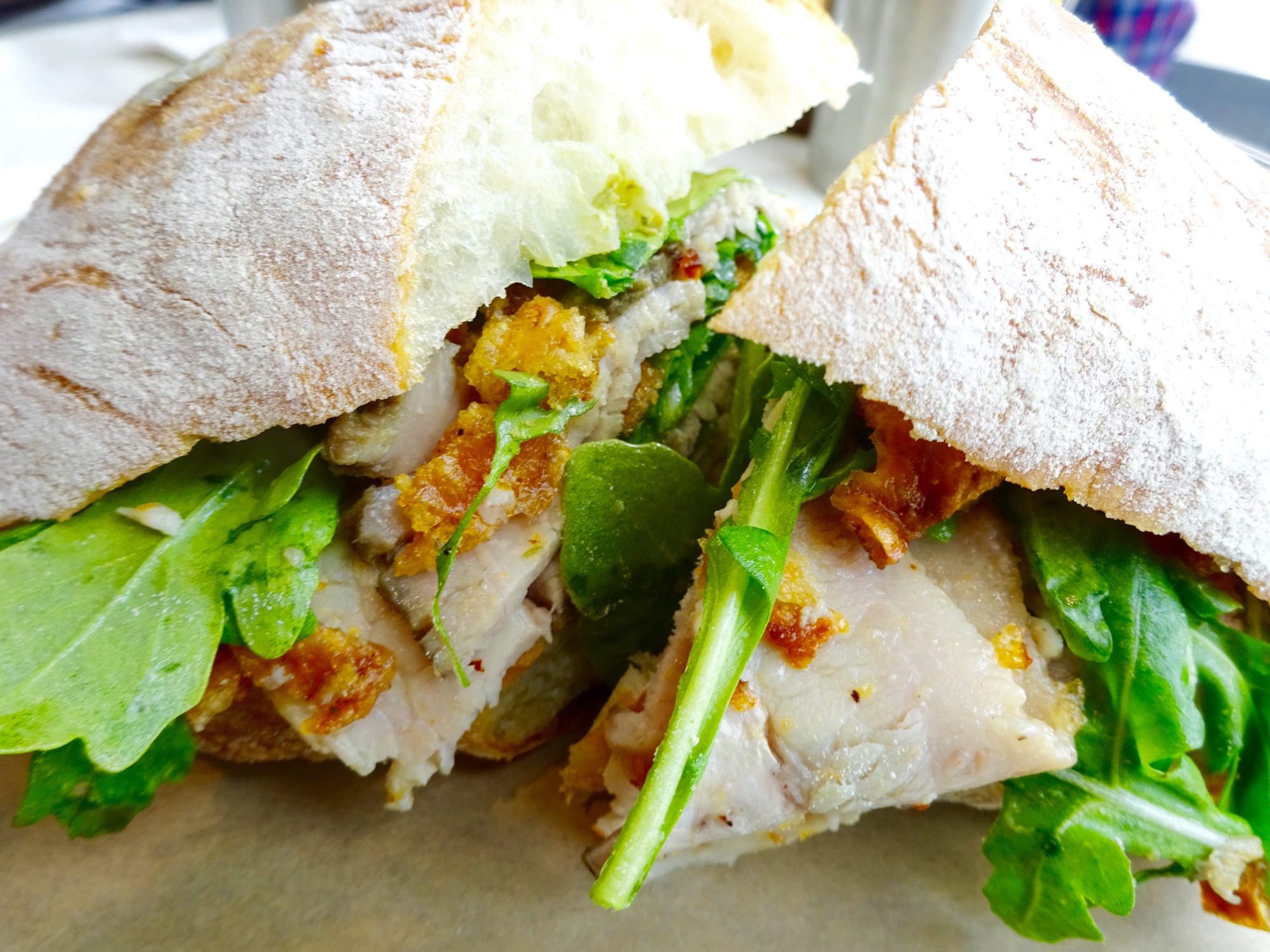 After debating between the Cubano and the Porchetta, I chose the Porchetta, with arugula and salsa verde, accented with crispy pork rinds. I gobbled my sandwich up as well.