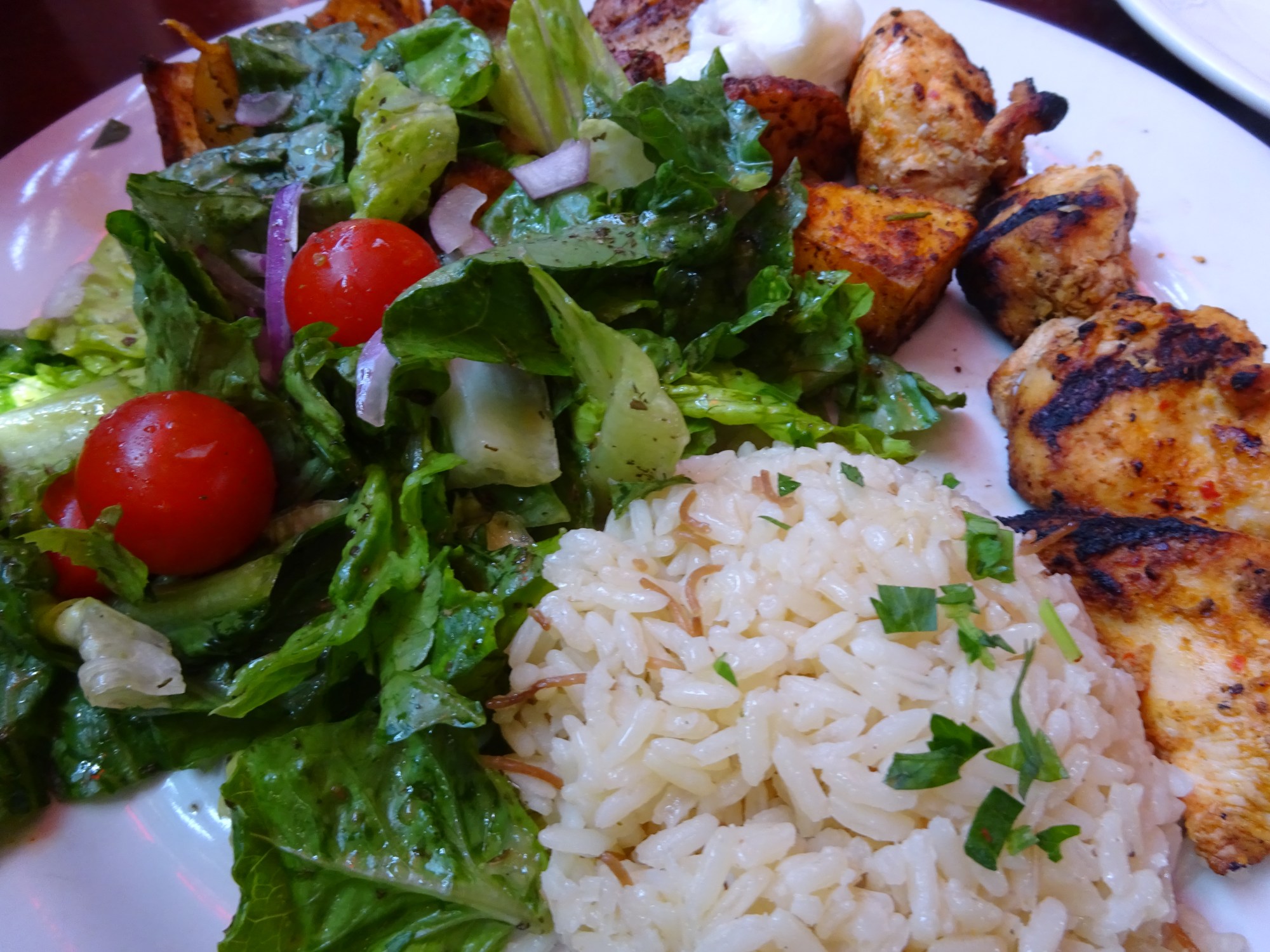 I ordered the chicken kebob plate, which came with salad, potatoes and fries.