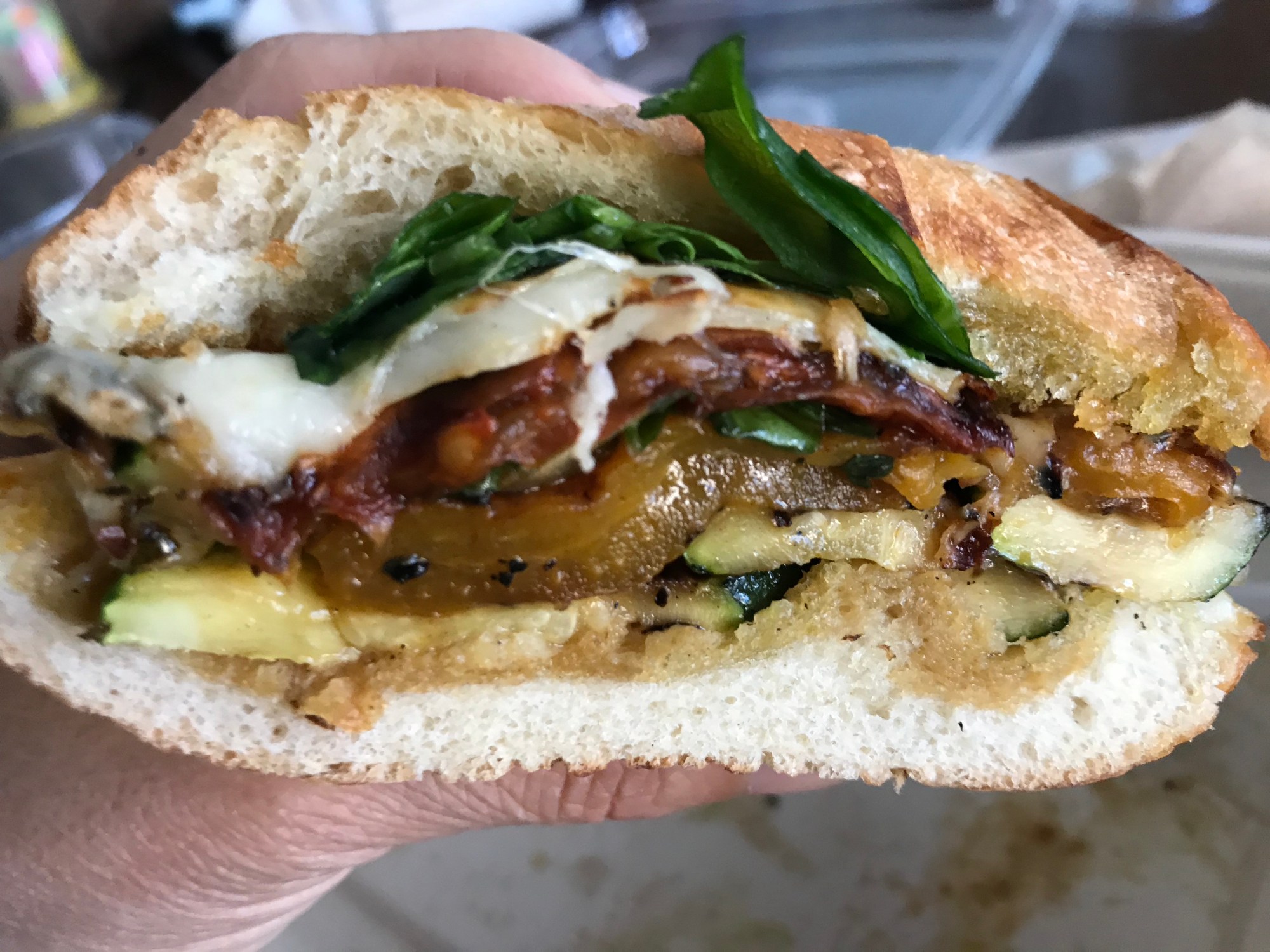 The Massimo Veggie was filled with grilled marinated veggies, roasted tomatoes, arugula and mozzarella on a pressed baguette. It was warm and tasty. Sandwiches are served with a small side salad of romaine, cherry tomatoes and kalamata olives (which come in their own container). If you like olives, you’ll love these olives. If you don’t like olives, you’ll be thankful that they’ve been separated from the rest of your salad.