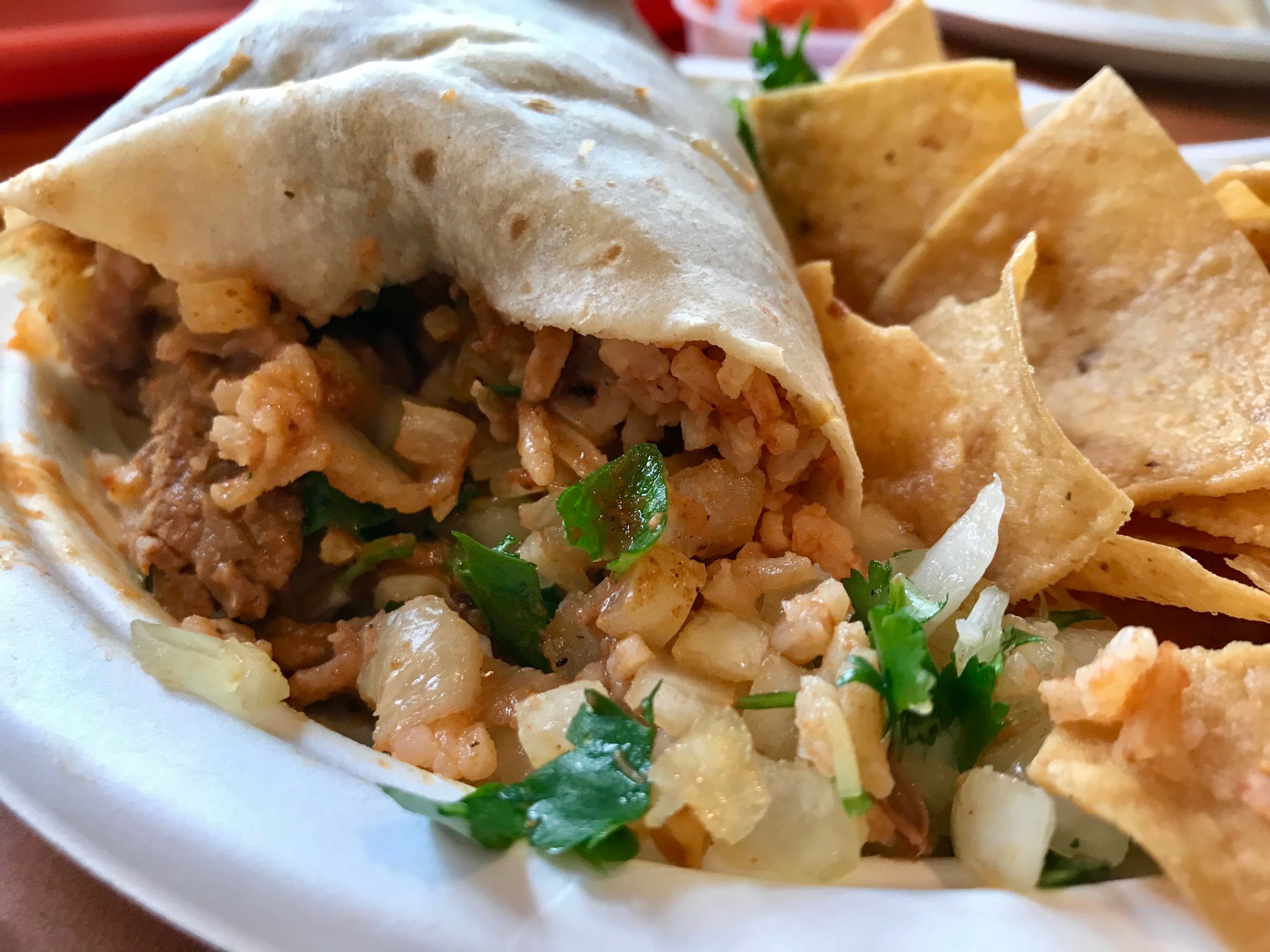 The al pastor burrito came stuffed with rice, beans, salsa, cilantro and onions – a lot of onions. My first bite was all onions. I’d probably guess there was anywhere from 1/3 cup to 1/2 cup of onions. The al pastor meat was ok, not great. Like the mahi mahi burrito, the pork serving was a little on the chintzy side. Although since it only cost $6.85, it was probably unrealistic to expect more.