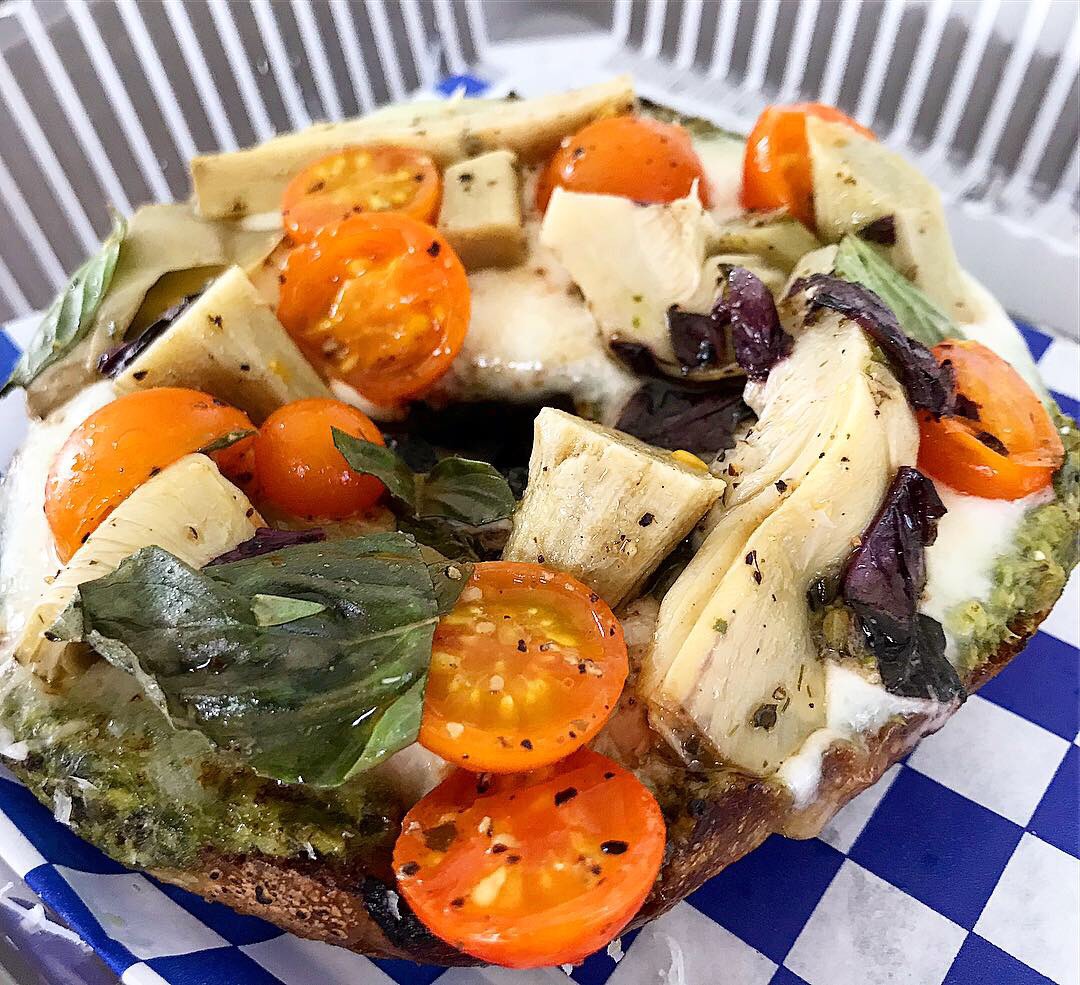 The vegetable pizza bagel had marinated artichokes, basil, tomatoes, mozzarella and pesto. Biting into it, the sweetness of the sun gold tomatoes were like little burst of sunshine, contrasting with the vinegary artichokes and pesto.