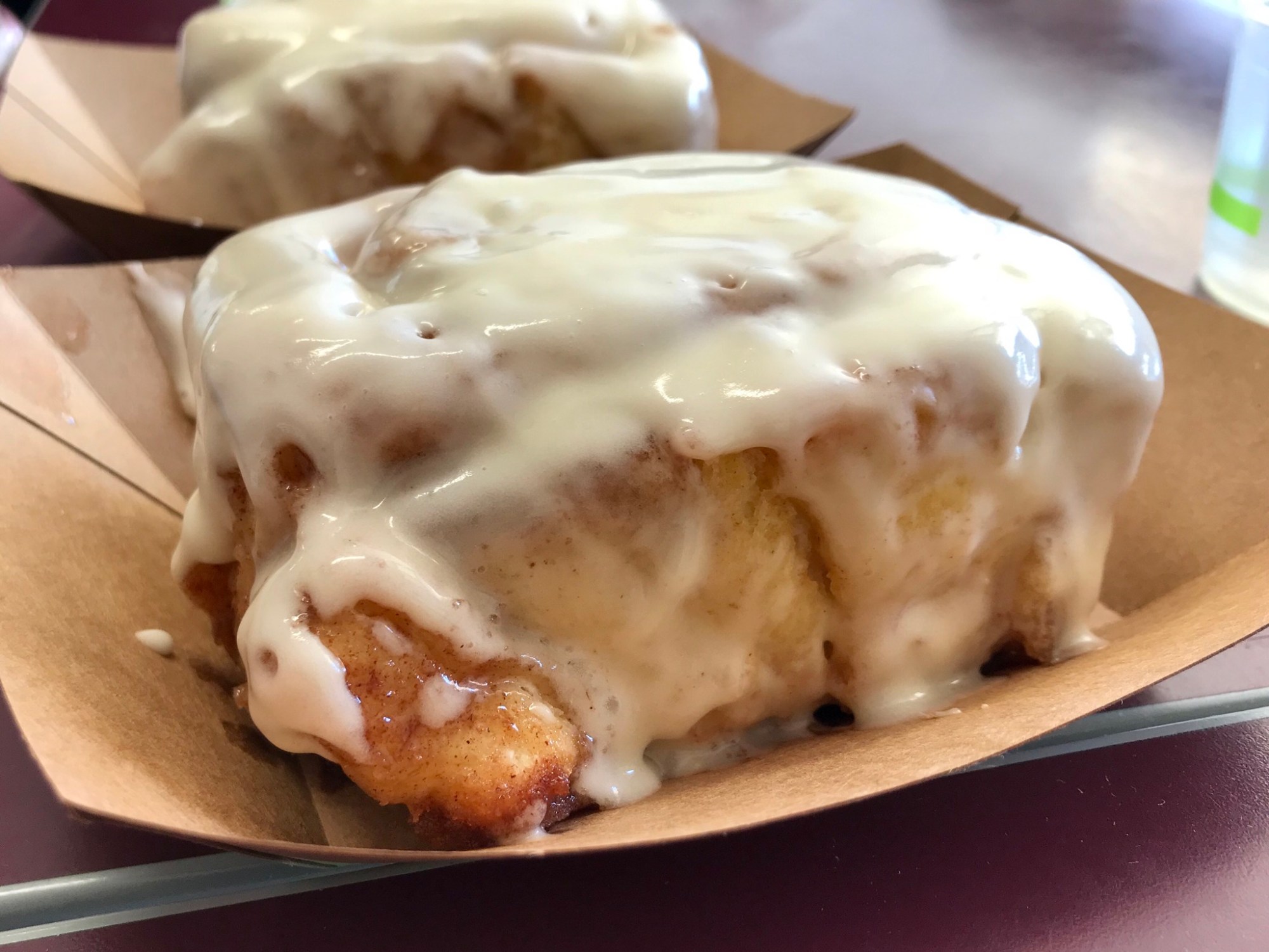 The cinnamon roll with cream cheese frosting proved to be irresistible – especially with that frosting cascading down that warm roll.