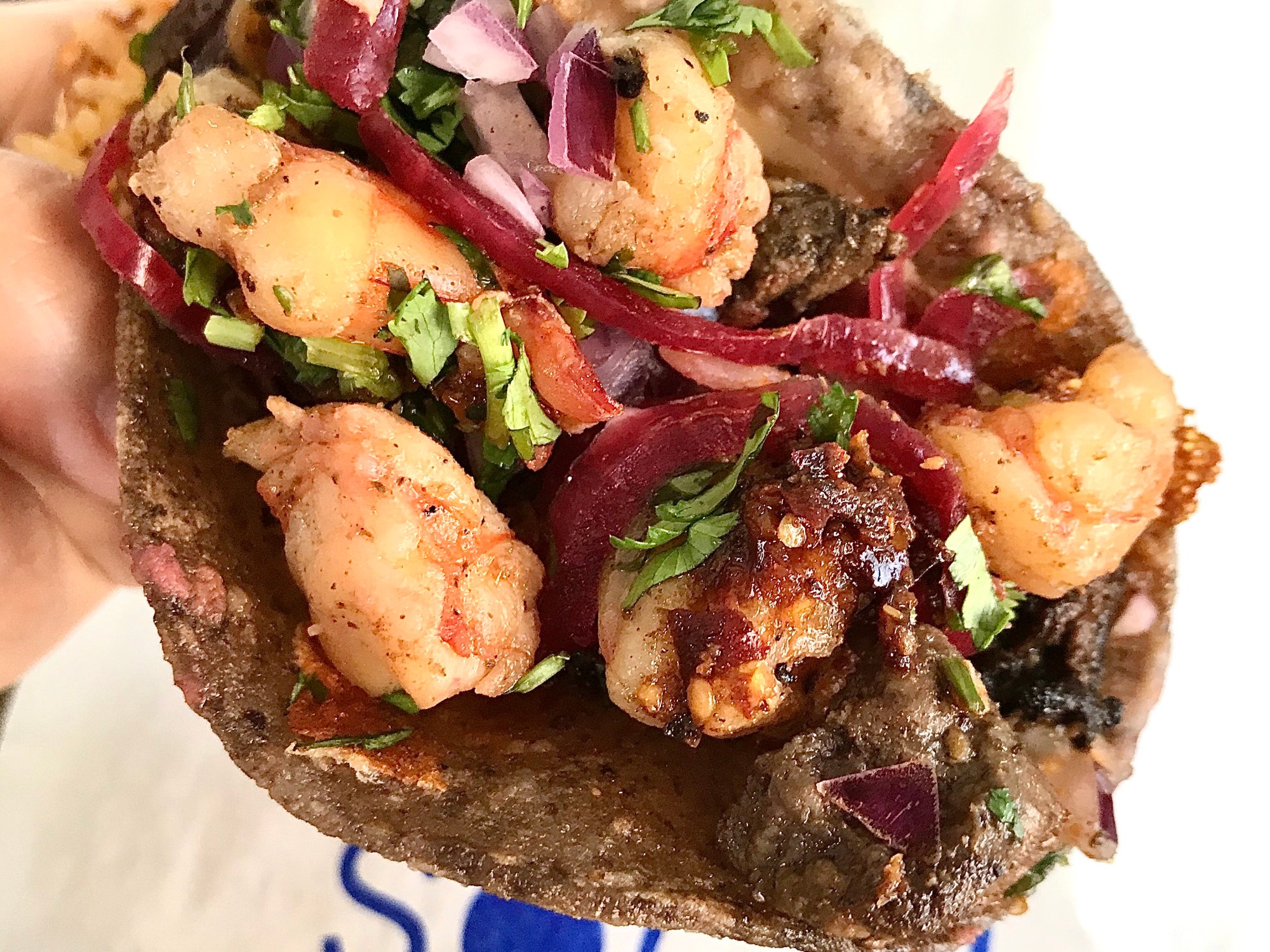 I opted for the Vampiro steak and shrimp tacos, that had griddled cheese and salsa macha on blue corn tortillas. They were slightly spicy and had so much steak and shrimp, that the filling kept falling out when I picked them up. My clothes were a mess afterwards, but it was worth it. The tacos were served with your standard rice and beans and some farmers’ market vegetables – mostly tomatoes and cucumbers, though there was a mint leaf and pomegranate seeds, which were a nice surprise.