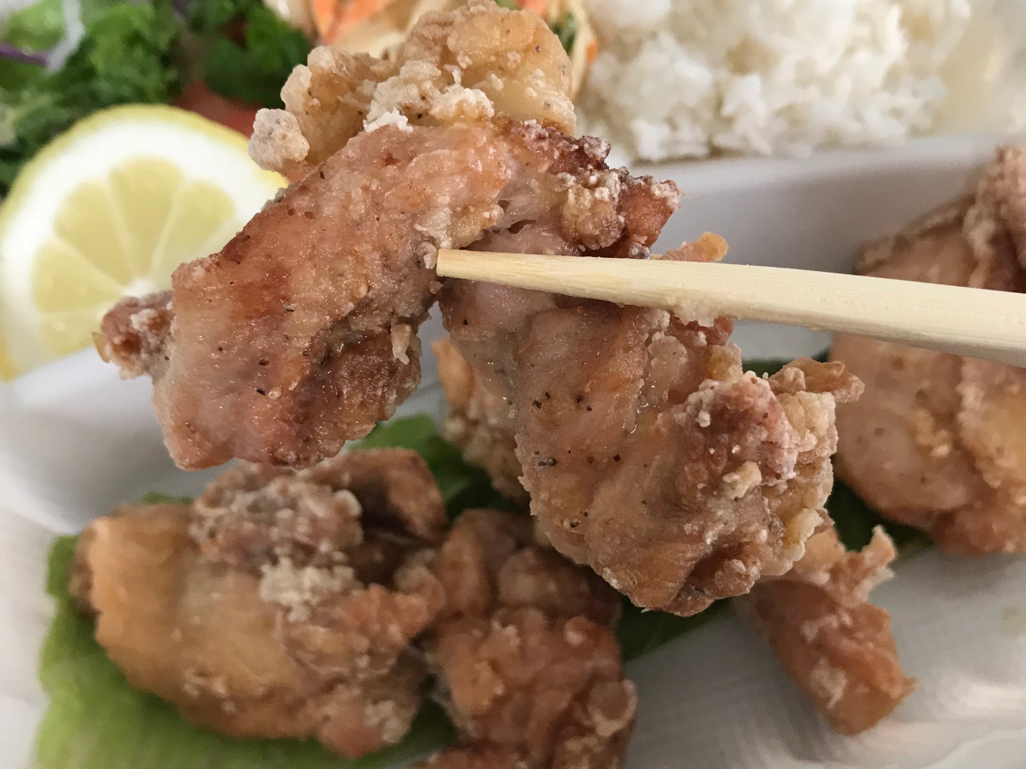 Entrees come with steamed rice, salad and a potato salad or macaroni salad. Kara age, Japanese fried chicken (which is one of my faves), was lightly fried, not too greasy.