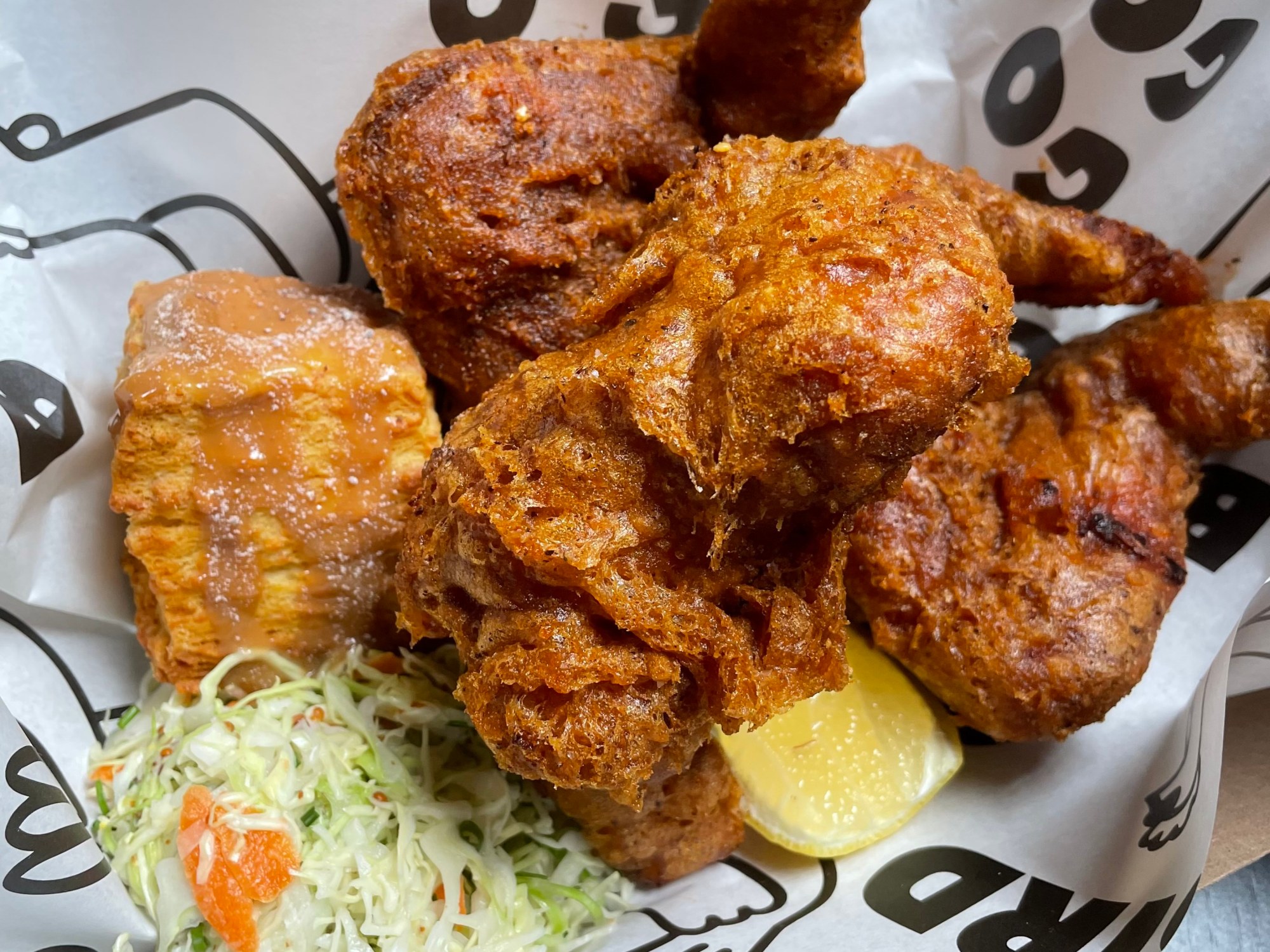 The meal came with some cooling coleslaw and the best biscuit I’ve ever eaten, flaky-layered perfection with an intoxicating drizzle of miso condensed milk.