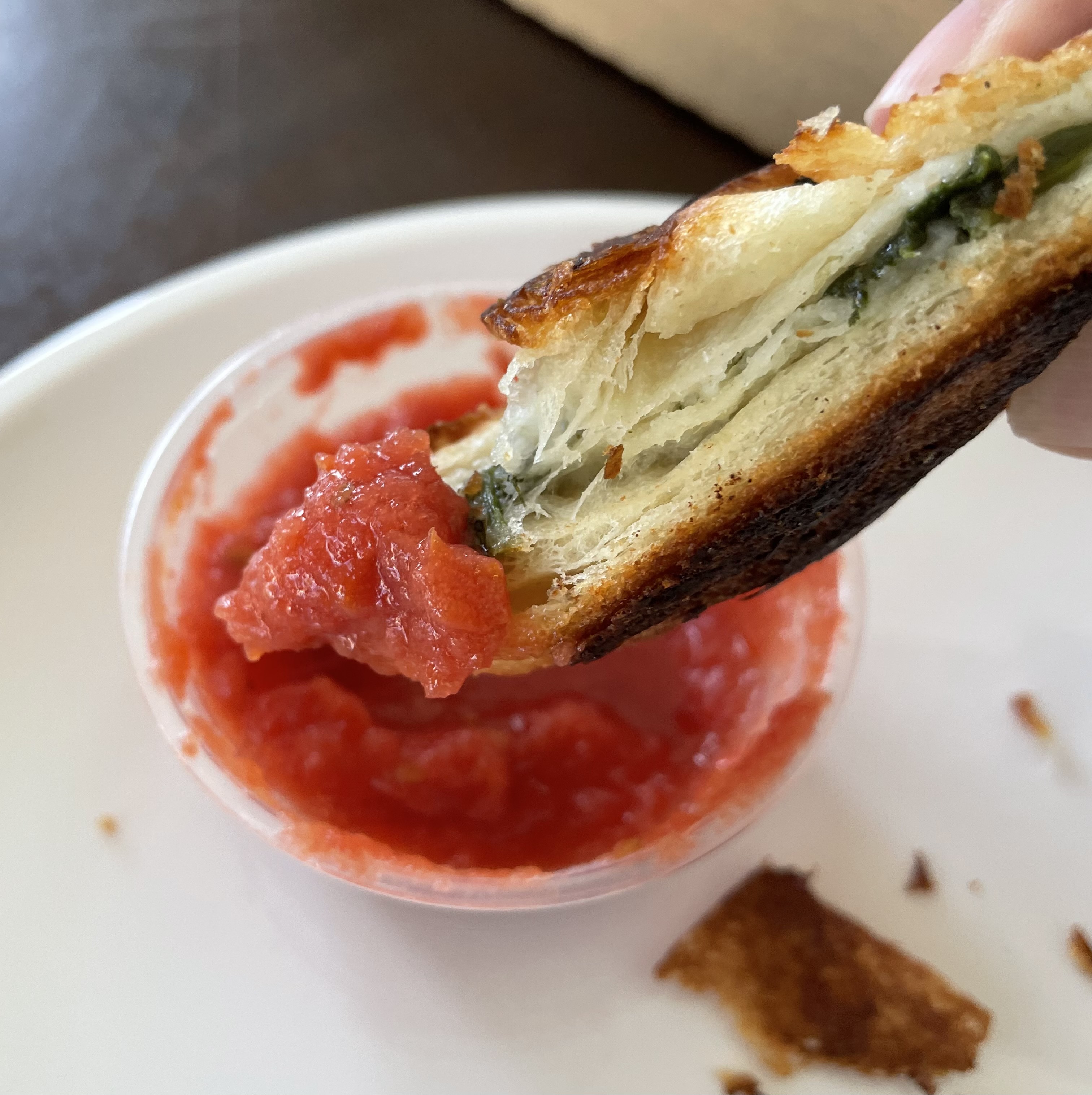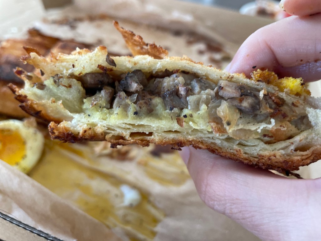 They have four flavors – cheese and zaatar, fungi/onion/truffle, potato & brown butter, and spinach & cheese. I tried a fungi and a spinach, preferring the spinach as it had a stronger flavor, thanks to the cheese. Orders come with tomato pulp, schug, pickles and eggs.