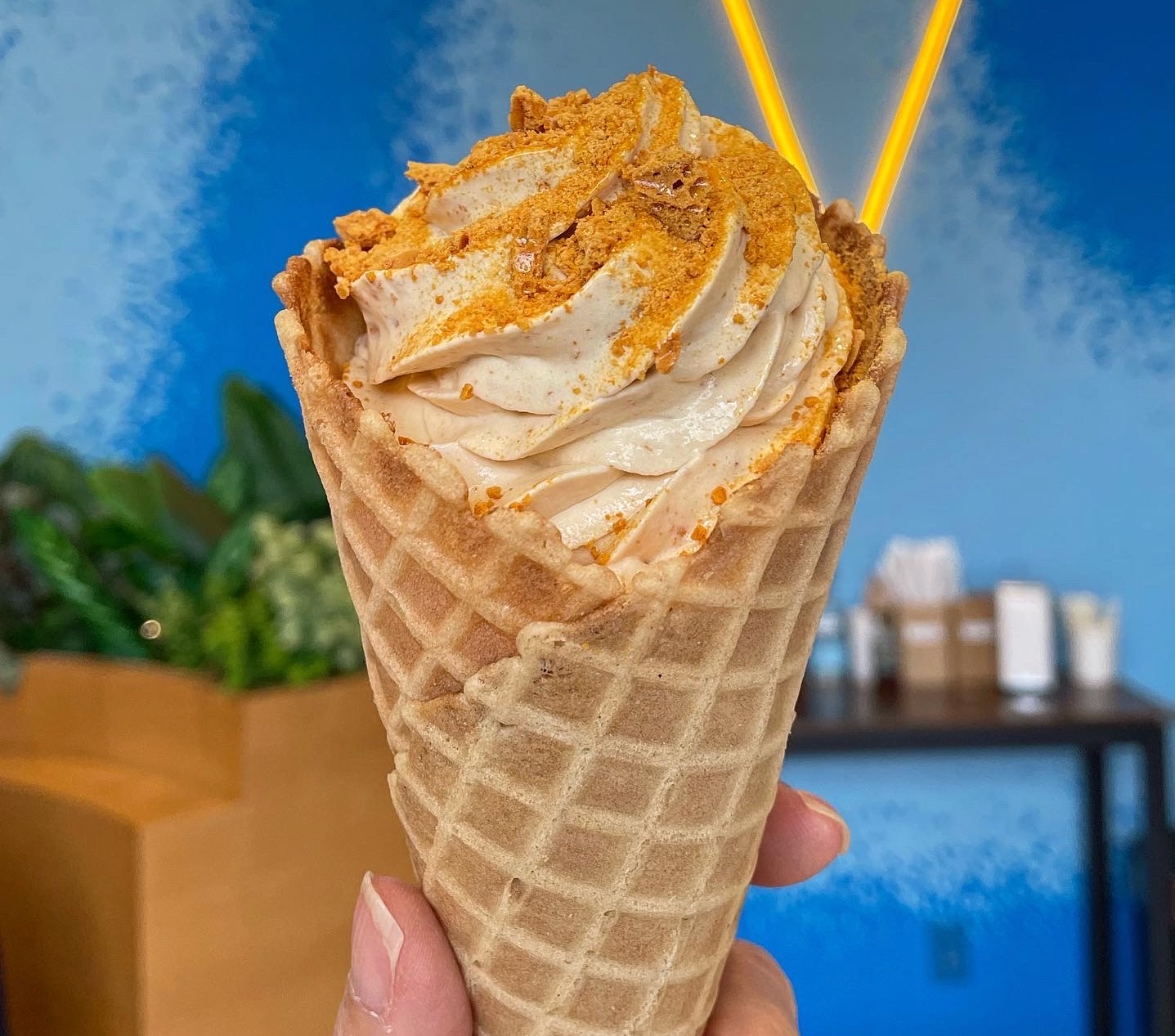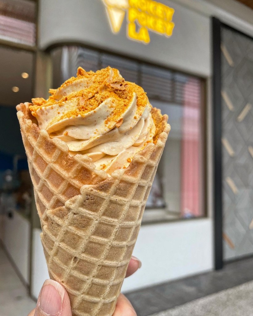 You don’t need any dancing ability to enjoy the newly opened Hokey Pokey at the Westfield Century City. In New Zealand, hokey pokey is honeycomb toffee, not a dance. Hokey Pokey makes theirs in-house and then uses it as a topping for their soft serve ice cream.